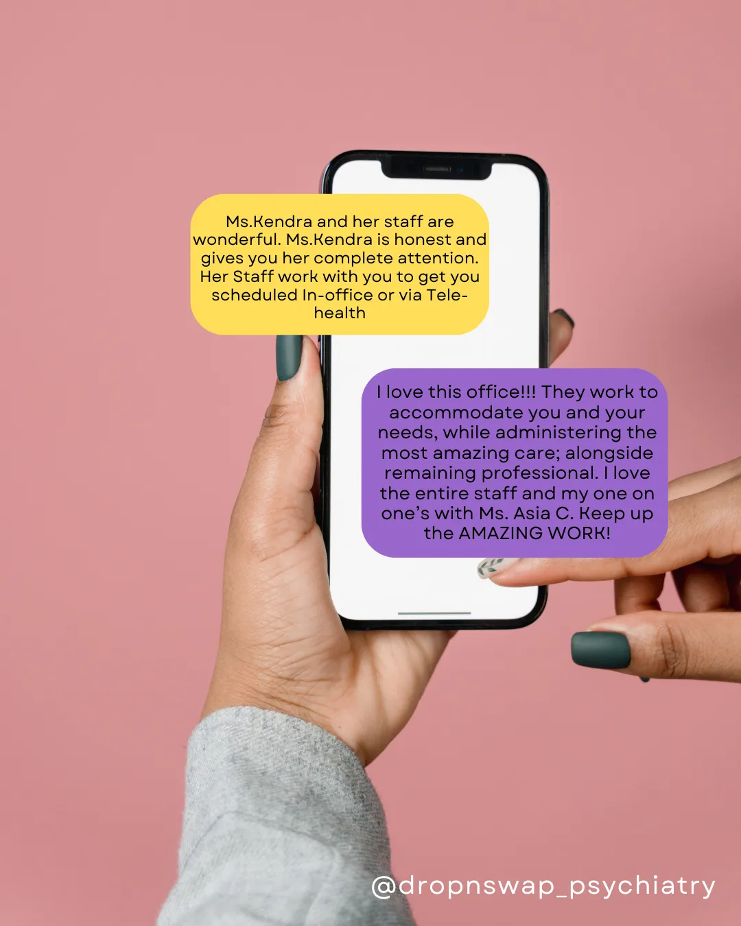 I highly recommend Drop N Swap Psychiatry. From my very first appointment, I felt welcomed into a safe and supportive environment where I could openly express myself. I felt so invulnerable with Ms. Kendra Butler. She takes the time to thoroughly explain diagnoses and treatment options, ensuring I feel informed and involved in my care. Rather than simply prescribing medication, she and the entire team genuinely prioritize their patients’ well-being, demonstrating unmatched compassion and patience.